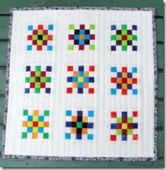 And, it’s perfect serendipity as well: there’s a mini up on one of my living room walls that I’ve wanted to swap out with something else. This is the perfect quilt for that spot – at the top of the stairs where the taupe blends perfectly with the new carpeting on the stairs, the entry way tile, and the little area rug that leads into the kitchen.